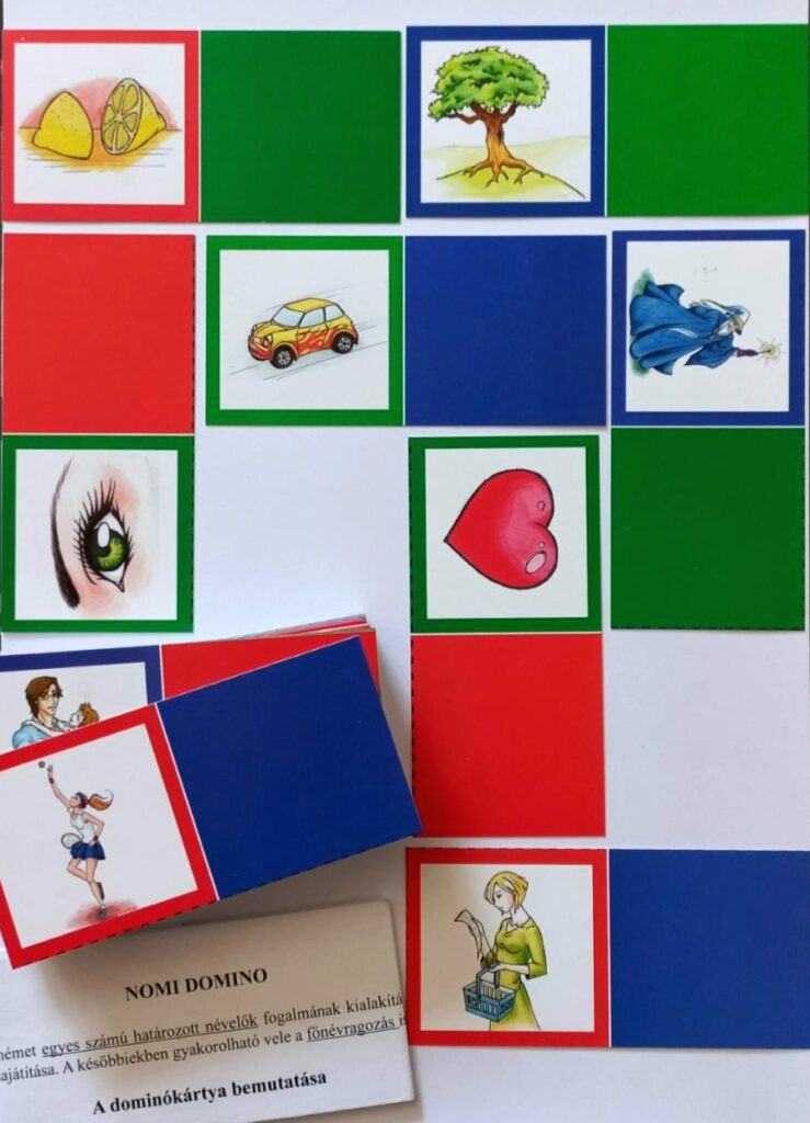 Ha ennél több játékos van, akkor a játékosok számától függően több NOMI DOMINO csomagra van szükség. A kártyákon szereplő főnevek megtanulásához a Frohes Lernen című könyv áll rendelkezésre. A könyv tanítói vagy szülői segítséggel is használható.A Joker dominókártyák bármikor felhasználhatóak, ha a játékos nem tud